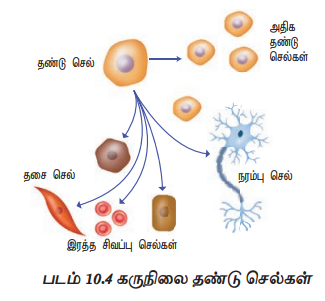 பாலூட்டிகளில், இரு முக்கிய தண்டு செல் வகைகள் காணப்படுகின்றன. அவை ‘கருநிலை தண்டு செல்கள்’ (Embryonic stem cells) மற்றும் ‘முதிர் தண்டு செல்கள் (Adult stem cells). கருநிலை தண்டு செல்கள் ‘பகுதித்திறன்’ (Pluripotent) கொண்டவை. அவற்றிற்கு, புற அடுக்கு, நடு அடுக்கு மற்றும் அக அடுக்கு என்னும் மூன்று அடிப்படை வளர்ச்சி அடுக்குகளையும் உருவாக்கும் திறன் உள்ளது. கருநிலை செல்கள் பல்திறன் (Multipotent) கொண்டவையாகவும் விளங்குகின்றன. அவை, பலவகையான செல்களாக மாற்றமுறும் திறன் படைத்தவை (படம் 10.4). கருக்கோளத்தினுள் காணப்படும் செல்திரளின் மேற்பகுதி திசுக்களில் (Epiblast tissue) இருந்து கருநிலை தண்டு செல்கள் பிரித்தெடுக்கப்படுகின்றன.