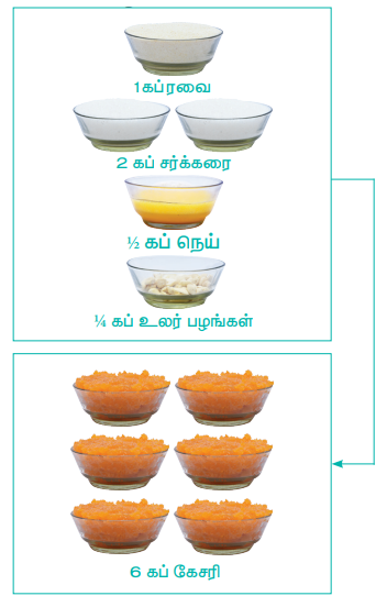 உனது வீட்டில் கேசரி தயார் செய்வதை நீ எப்போதாவது பார்த்திருக்கிறாயா? கேசரி தயாரிப்பதில் உள்ள முறைகளில், ஒரு முறையினைப் பயன்படுத்தி ஆறு கப் கேசரி தயாரிக்கத் தேவையான பொருட்களின் விவரம் பின்வருமாறு: