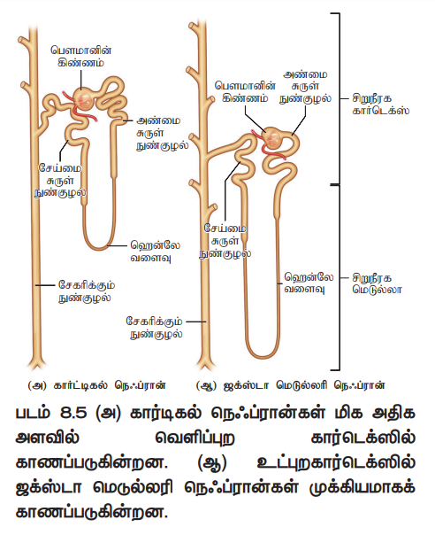 பெரும்பாலான நெஃப்ரான்களின் ஹென்லேயின் வளைவு குட்டையாகவும், அதன் மிகச்சிறிய பகுதி மட்டுமே மெடுல்லாவினுள் நீட்டிக்கொண்டும் இருக்கின்றது. இதற்கு கார்டிகல் நெஃப்ரான்கள் என்று பெயர். வேறு சில நெஃப்ரான்கள் மிக நீண்ட ஹென்லேயின் வளைவு கொண்டதால் அவை, மெடுல்லரி பகுதியின் ஆழ் பகுதி வரை நீண்டு அமைந்துள்ளது. இத்தகைய நெஃப்ரான்கள் ஜக்ஸ்டா மெடுல்லரி நெஃப்ரான்கள் என்றழைக்கப்படுகின்றன (மெடுல்லா அருகு நெஃப்ரான்கள்) (படம் 8.5 அ மற்றும் ஆ).