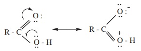 இந்த மூன்று p- ஆர்பிட்டால்களும் ஒன்றுக்கொன்று இணையாக இருப்பதால் ஒரு π பிணைப்பை உருவாக்குகின்றன. இந்த π பிணைப்பானது ஒரு புறம் கார்பன் மற்றும் ஆக்ஸிஜன் அணுக்களுக்கிடையேயும், மற்றொரு புறம் கார்பன் மற்றும் OH தொகுதியிலுள்ள ஆக்ஸிஜன் அணுக்களுக்கிடையேயும் பகுதியளவு உள்ளடங்காத் தன்மையினை பெற்றுள்ளது. அதாவது, RCOOH ஐ பின்வரும் இரு வடிவமைப்புகளின் உடனிசைவு இனக்கலப்பாக குறிப்பிட முடியும்.