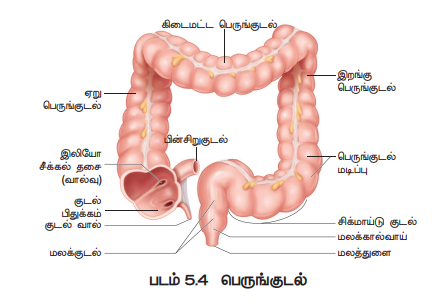 பெருங்குடலில், பிதுக்கப்பகுதி, (Caecum) பெருங்குடல் பகுதி (Colon) மற்றும் மலக்குடல் (Rectum) எனும் மூன்று பகுதிகள் உள்ளன. சிறுகுடல், பெருங்குடலுடன் பிதுக்கப் பகுதியில் இணைகிறது. இதன் அடிப்பகுதியில் உள்ள குறுகிய விரல் போன்ற குழல் தன்மை கொண்ட நீட்சி குடல்வால் (Vermiform appendix) எனப்படும். தாவர உண்ணிகளில் குடல் பிதுக்கப்பகுதியும் குடல் வால் பகுதியும் மிகப் பெரியதாக அமைந்துள்ளது. இங்குள்ள நன்மை செய்யும் பாக்டீரியாக்கள் செல்லுலோஸ் செரித்தலுக்கு உதவுகின்றன. கோலன் எனும் பெருங்குடலானது, ஏறுகுடல், கிடைமட்டக்குடல், இறங்கு குடல் மற்றும் சிக்மாய்டு குடல் என்ற நான்கு பகுதிகளைக் கொண்டது. பெருங்குடலின் உட்பகுதியில் உள்ள பை போன்ற விரிவுகள் ஹாஸ்டிரா (Haustra) (ஒருமையில் ஹாஸ்டிரம் - Haustrum) எனப்படும் (படம் 5.4)