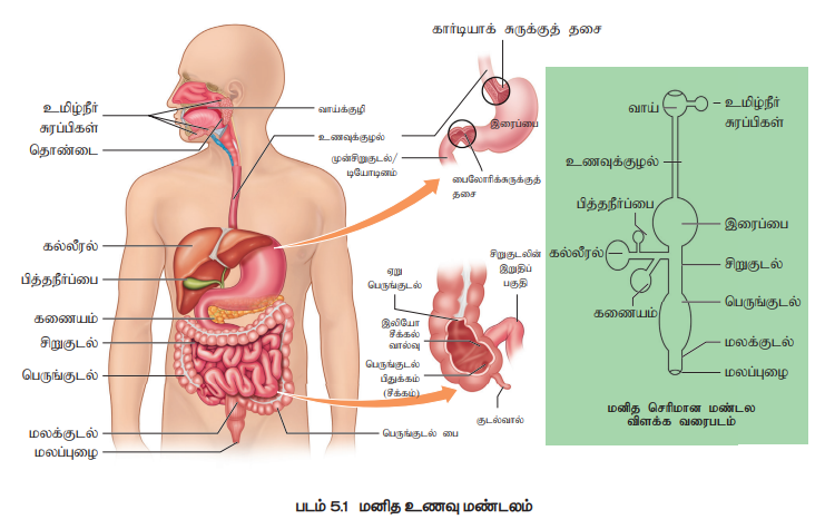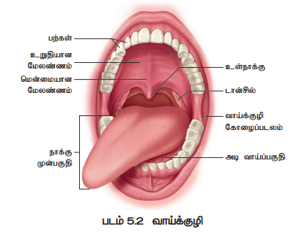 நீண்ட, தசையாலான உணவுப்பாதையானது முன்பக்கத்தில் வாயில் துவங்கிப் பின்பக்கத்தில் மலத்துளையில் முடிகிறது. உணவுப்பாதையில் வாய், வாய்க்குழி, தொண்டை, உணவுக்குழல், இரைப்பை, குடல், மலக்குடல் மற்றும் மலத்துளை ஆகியன அடங்கும். (படம் 5.1) வாயானது உணவைப் பெறும் பகுதியாகும் அது வாய்க்குழிக்குள் திறக்கிறது. வாய்க்குழியில் பற்கள், நாக்கு ஆகியவற்றின் மூலம் உணவு அரைக்கப்படுகின்றது. உமிழ்நீர்ச் சுரப்பிகளால் சுரக்கப்படும் உமிழ்நீரில் உள்ள நொதிகள் வேதிய செரித்தலைத் துவக்குகின்றன.