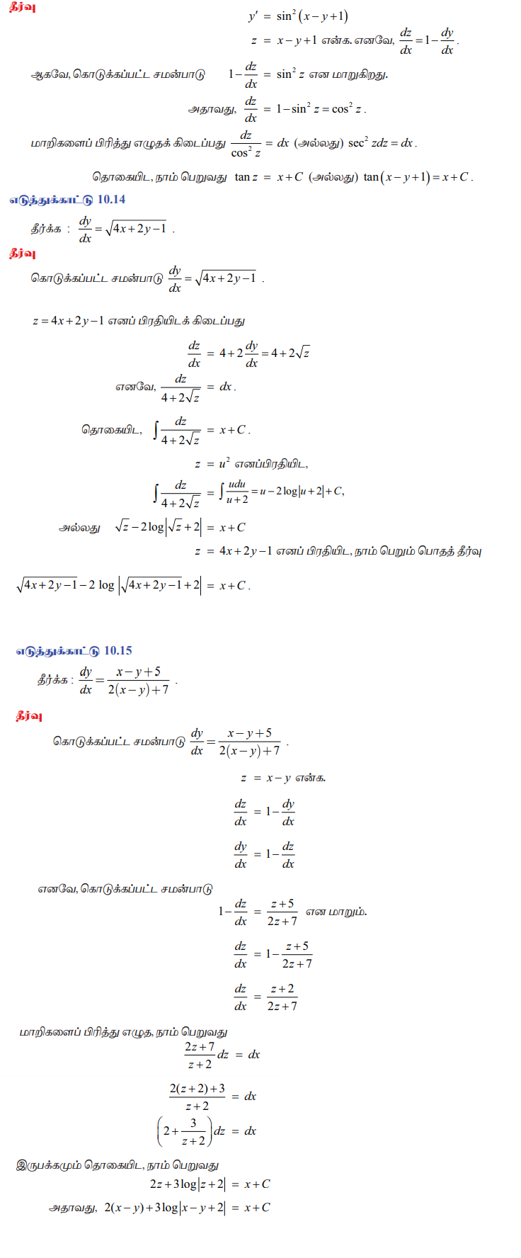 முதல் வரிசை, முதற்படி வகைக்கெழுச் சமன்பாடுகளின் தீர்வு (Solution of First Order and First Degree Differential Equations) | கணிதவியல் - பிரதியீட்டு முறை (Substitution Method) | 12th Maths : UNIT 10 : Ordinary Differential Equations