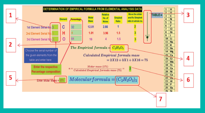 நிலை 4: மூலக்கூறு வாய்ப்பாட்டினைக் கணக்கிட, தொடர்புடைய கட்டம் (5)ல் மோலார் நிறையினைப் பதிவு செய்க. இப்பொழுது 'n' ஆனது திரையில் (6)ல் தோன்றும், மேலும் மூலக்கூறு VVV கீழே (7)ல் தெரியும்.