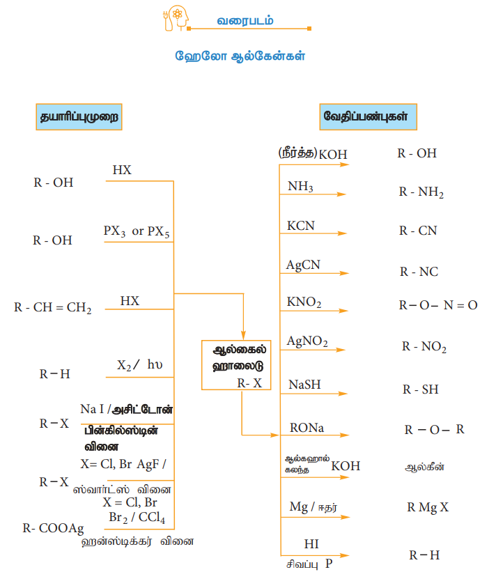● ஆல்கேன்கள், ஆல்கீன்கள் அல்லது ஆல்கஹால்களிலிருந்து ஹேலோ ஆல்கேன்களைப் பெறலாம். ஹேலோ ஆல்கேன்கள் அவற்றிற்கு இணையான ஹைட்ரோகார்பன்களைக் காட்டிலும் அதிக கொதிநிலையினைப் பெற்றுள்ளன.