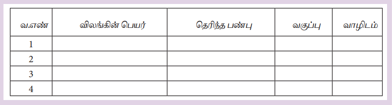 இச்செயல் திட்டத்தின் முக்கிய நோக்கம் என்னவென்றால் பாடங்களைப் படிப்பதற்கு முன் கொடுக்கப்பட்டுள்ள படங்களை நன்கு உற்றுநோக்கி அவற்றின் பண்பு நலன்களை அறிந்து கொண்டதன் அடிப்படையில் ஒவ்வொரு விலங்கும் எந்த வகுப்பைச் சேர்ந்தது என்று வரிசைப்படுத்த வேண்டும். விலங்குகளின் ஒவ்வொரு வகுப்பிற்கும் ஒரு பண்பினைக் குறிப்பிடவேண்டும்.
