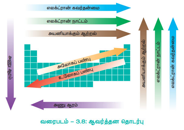 அணு ஆரம், அயனி ஆரம், அயனியாக்கும் ஆற்றல் எலக்ட்ரான் நாட்டம் மற்றும் எலக்ட்ரான் கவர்தன்மை போன்ற ஆவர்த்தன பண்புகள் ஆவர்த்தன தொடர்பினை பெற்றுள்ளன. ஆவர்த்தன பண்புகளின் போக்கில் ஏற்படும் மாற்றங்கள் பின்வரும் வரைபடத்தில் கொடுக்கப்பட்டுள்ளது.