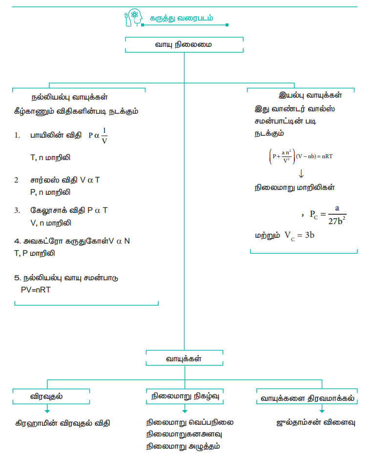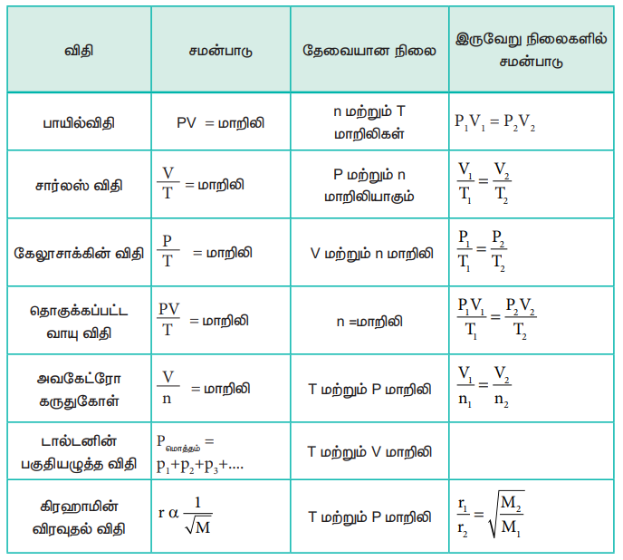 அழுத்தம் (P), கனஅளவு (V), வெப்பநிலை (T) மோல்களின்எண்ணிக்கை (n) ஆகிய நான்கு தனித்த மாறிகளுக்கு இடையேயான தொடர்பினைக் கொண்டு ஒருவாயுவின் நிலையினை நன்கு வரையறுக்கலாம். இந்த அளவீடுகளுக்கு இடையேயான தொடர்பானது பல்வேறு வாயுவிதிகளின் படி பின்வருமாறு சுருக்கமாக தரப்படுகிறது.