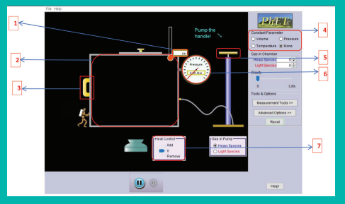 மேற்காண் செயல்முறைகளைப் பயன்படுத்தி வாயுக் கோட்பாடுகளை அறிந்துகொள்ளலாம். பாயில் விதியை அறிந்துகொள்ள, வெப்பநிலையை மாறிலியாக (4) வைத்துக்கொண்டு சிறிது வாயு மூலக்கூறுகளை (5) உட்செலுத்தி, அதை மாறிலியாக வைத்துக்கொள்ளவும். இப்பொழுது அறையின் இடது பக்கச் சுவற்றை (3) நகர்த்தி கொள்ளளவைக் குறைத்து வாயுவின் அழுத்தம் அதிகரிப்பதைக் காணலாம். அவ்வாறே பிற இரண்டு வாயுக் கோட்பாடுகளையும் மெய்ப்பிக்கலாம்.