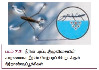 நீர் பூச்சிகள் (Water bugs) மற்றும் நீர் தாண்டிப்பூச்சிகள் (Water striders) நீரின் மேற்பரப்பில் நடக்கின்றன (படம் 7.21) நீர்ம மூலக்கூறுகள் உள்நோக்கி இழுக்கப்படுவதால் நீரின் மேற்பரப்பானது மீட்சியுள்ள அல்லது இழுத்துக்கட்டப்பட்ட படலத்தைப் போன்று செயல்படுகிறது. இது நீர் பூச்சிகளின் எடையை சமன் செய்து அவை நீரின் மேற்பரப்பில் நடக்க உதவுகிறது. இந்த நிகழ்வை பரப்பு இழுவிசை என அழைக்கின்றோம்.