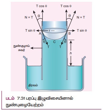 திரவமும், காற்றும் சந்திக்குமிடத்தில் உள்ள வளைந்த பரப்பின் மீது ஏற்படும் அழுத்த வேறுபாடே திரவமானது நுண்புழைக்குழாயில் மேலேறுவதற்குக் காரணமாக அமைகிறது (ஈர்ப்பின் விளைவைப் புறக்கணிக்க). மிக நுண்ணிய குழாய்களில் நுண்புழையேற்றமானது அதிகமாக உள்ளது. இந்நிகழ்வானது பரப்பு இழுவிசையின் வெளிப்பாடாகும். நுண்புழையேற்றத்திற்கும் (h) பரப்பு இழுவிசைக்கும் (T) உள்ள தொடர்பைப் பெற நுண்புழைக்குழாய் ஒன்று கொள்கலனிலுள்ள நீரில் அமிழ்த்தி வைத்திருப்பதாகக் கருதுக. நுண்புழைக்குழாயில் நீரானது பரப்பு இழுவிசையின் காரணமாக h உயரத்திற்கு மேலேறுகிறது. (படம் 7.31)