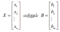 என்பவை x1, x2, x3, ..., xn என்ற மாறிகளால் உருவான n × 1 மற்றும் b1, b2, b3, ..., bm என்ற மாறிலிகளால் உருவாக்கப்பட்ட m × 1 நிரல் அணிகள் என்க.