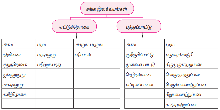 இரண்டாயிரம் ஆண்டுகளுக்கு முற்பட்டவை சங்க இலக்கியங்கள். அவை இரண்டு வகைப்படும். ஒன்று எட்டுத்தாகை. மற்றொன்று பத்துப்பாட்டு. எட்டுத்தொகை என மூன்று வகையாகப் பிரிக்கப்படுகிறது. அகம் சார்ந்த இலக்கியங்கள் ஐந்து: நற்றிணை, குறுந்தொகை, ஐங்குறுநூறு, அகநானூறு, கலித்தொகை. புறம் சார்ந்த நூல்கள்: புறநானூறு, பதிற்றுப்பத்து. அகமும் புறமும் சார்ந்த நூல் பரிபாடல் ஆகும். பத்துப்பாட்டு அகம், புறம் என இரண்டு வகையாகப் பிரிக்கப்படுகின்றன. அகம் சார்ந்த நூல்கள்: குறிஞ்சிப்பாட்டு, முல்லைப்பாட்டு, நெடுநல்வாடை, பட்டினப்பாலை. புறம் சார்ந்த நூல்கள்: மதுரைக் காஞ்சி, திருமுருகாற்றுப்படை, பொருநராற்றுப்படை, பெரும்பாணாற்றுப்படை, சிறுபாணாற்றுப்படை, கூத்தராற்றுப்படை. இவற்றுள் ஆற்றுப்படை நூல்கள் ஐந்து ஆகும்.