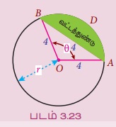 எடுத்துக்காட்டு 3.56 8 கி.மீ. விட்டமுள்ள வட்ட வடிவ மிருகக்காட்சி பூங்கா ஒன்றை அமைக்க அரசு திட்டமிடுகிறது. கால்நடை மருத்துவமனை அமைக்க 4 கி.மீ. நிளமுடைய வட்ட நாண் கொண்ட வட்டத்துண்டு தனியாக ஒதுக்கப்படுகிறது. கால்நடை மருத்துவமனை அமைக்க ஒதுக்கப்பட்ட வட்டத்துண்டின் பரப்பைக் காண்க.