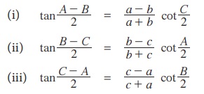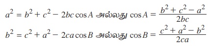 குறிப்பு: (i) a2 = b2 + c2 - 2bc cos A என்பது ஒரு முக்கோணத்தின் ஒரு பக்கத்தின் வர்க்கம் மற்ற இரண்டு பக்கங்களின் வர்க்கங்களின் கூடுதலிலிருந்து அவைகளின் பெருக்கட்பலனின் இருமடங்கை அவ்விரு பக்கங்களுக்கு இடைப்பட்ட கோணத்தின் கொசைன் மதிப்போடு பெருக்கக் கிடைக்கும் மதிப்பைக் கழிக்கக் கிடைக்கும் மதிப்புக்குச் சமம். மேலும் a, b, c ஆகிய எழுத்துக்களை ஒரு சூத்திரத்தில் சுழற்றும் போது மற்றொரு சூத்திரம் கிடைக்கப் பெறுகிறது.