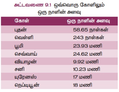 பூமியில் ஒரு நாள் என்பது 24 மணி ஆகும். அட்டவணை 9.1-ல் ஒவ்வொரு கோளின் சுழற்சிக்காலமும் கொடுக்கப்பட்டுள்ளது.