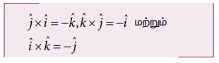 (vii) வலதுகை திருகு விதியின்படி, செங்குத்து ஓரலகு வெக்டர்களின் வெக்டர் பெருக்கல் கீழ்க்கண்டவாறு காணப்படும்.