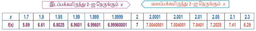 x−ன் மதிப்பு 2−க்கு இடமிருந்தும் (2−ஐ விட குறைவான மதிப்புகள்) வலமிருந்தும் (2−ஐ விட அதிக மதிப்புகள்) 2−ஐ நெருங்கும்போது f(x)−ன் மதிப்பு 7−ஐ நெருங்குகிறது. அதாவது x−ன் மதிப்பு 2−க்கு மிக நெருக்கமாக அமையும்போது f(x)−ன் மதிப்பு 7−க்கு மிக அருகில் அமைகிறது. இந்தச் சூழலை சுருக்கமாக பின்வருமாறு கூறலாம்.