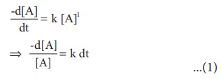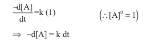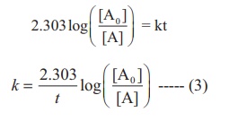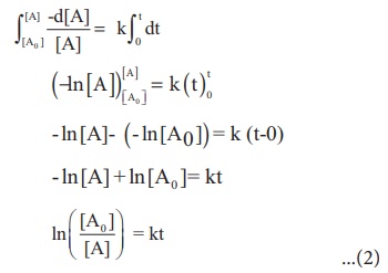 t = 0 எனும் போது செறிவு [Ao] மற்றும், t = t எனும் போது செறிவு [A] என அமையும் எல்லையில் மேற்கண்டுள்ள சமன்பாட்டை தொகையிட