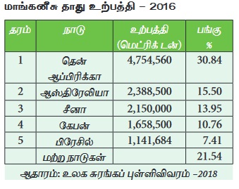 தென் ஆப்பிரிக்கா, ஆஸ்திரேலியா, சீனா, கேபன், கஜகஸ்தான், பிரேசில், இந்தியா, கானா, உக்ரைன் மற்றும் மெக்சிகோ ஆகியவை மாங்கனீசு தாது காணப்படும் முக்கிய நாடுகளாகும். தென் ஆப்பிரிக்கா உலகில் மாங்கனீசு தாது உற்பத்தியில் மிகப்பெரிய நாடாகும். அடுத்ததாக ஆஸ்திரேலியா உள்ளது. பிரேசில், கேபன் மற்றும் சீனா ஆகியவை மாங்கனீசு உற்பத்தியில் முன்னணியில் உள்ள மற்ற நாடுகளாகும். இந்தியா உலகளவில் மிகப்பெரிய மாங்கனீசு தாது இருப்பைப் பெற்றிருந்தபோதிலும் உலகளவில் மாங்கனீசு தாது உற்பத்தியில் எட்டாவது பெரிய நாடாகவே உள்ளது.