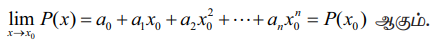P(x) = a0 + a1x + a2x2 +... + anxn ஒரு பல்லுறுப்புக் கோவை என்க. இங்கு a0, a1,… an என்பன மெய்யெண்கள் மற்றும் n ஒரு நிலையான மிகை முழு எண், எனில்