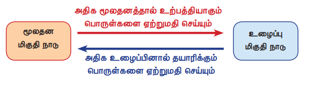 * திறன் உழைப்பின் இருப்பு → சிறப்புத் தேர்ச்சி → ஏற்றுமதி →திறனற்ற உழைப்பு கொண்ட நாடுகளால் உற்பத்தி செய்யப்பட்ட பண்டங்கள், பணிகளுக்குப் பரிமாற்றம் செய்தல்