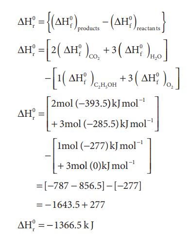 என்ற வினைக்கு திட்ட என்தால்பி மாற்ற மதிப்பை கணக்கிடுக. C2H5OH (l), CO2 (g) மற்றும் H2O (l) ஆகியவற்றின் திட்ட உருவாதல் என்தால்பி மதிப்புகள் முறையே 277, -393.5 மற்றும் -285.5 kJ mol-1 வரையறையின் படி O2(g) ன் திட்ட உருவாதல் என்தால்பி மதிப்பு பூஜ்ஜியமாகும்.