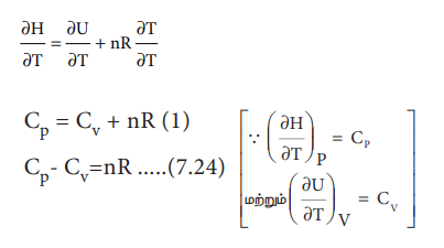 CP - CV = nR ----- (7.24) [ ∵ (∂H / ∂T)P = Cp மற்றும் (∂U / ∂T)V = CV ]