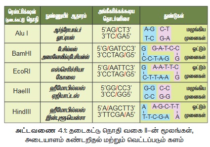 வகை || நொதி மட்டும் மறுகூட்டிணைவு DNA தொழில்நுட்பத்தில் அதிகம் பயன்படுத்தப்படுகிறது. பொதுவாக, இது 4 – 8 bp (base pairs) கொண்டுள்ள ஒரு குறிப்பிட்ட தொடர்வரிசைக்குள்ளே DNAஐ அடையாளம் கண்டறிந்து துண்டிக்கிறது. சில நொதிகளுக்கான எடுத்துக்காட்டுகள் அட்டவணையாக 4.1ல் கொடுக்கப்பட்டுள்ளன.