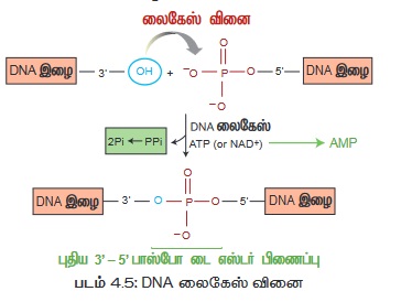 DNA லைகேஸ் நொதி இரட்டை இழை DNA (dsDNA) வின் சர்க்கரை மற்றும் பாஸ்ஃபேட் மூலக்கூறுகளை 5’ - PO4 மற்றும் ஒரு 3’ - OH உடன், ஒரு அடினோசைன் டிரை பாஸ்ஃபேட் (ATP) சார்ந்த வினையில் சேர்க்கின்றது. இது T4. ஃபாஜிலிருந்து பிரித்தெடுக்கப்படுகிறது.