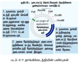 3. நகலாக்கக் களம் (Cloning Site): அன்னிய DNA ஐ இணைக்கும் பொருட்டு, தாங்கிக்கடத்திக்கு சில களங்கள் இருப்பினும் ஒரே ஒரு அடையாளக் களம் விரும்பத்தக்கதாக உள்ளது.