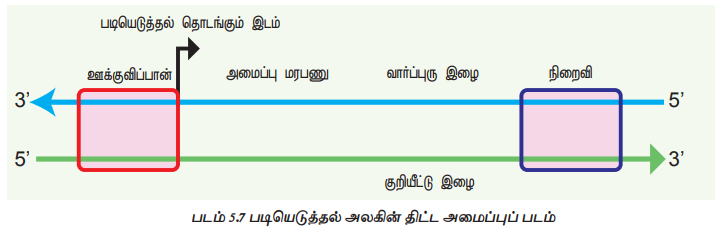 படியெடுத்தல் அலகில் உள்ள டி.என்.ஏவின் இரு இழைகளும் எதிரெதிர் துருவத்துவம் பெற்றவை. டி.என்.ஏ சார்ந்த ஆர்.என்.ஏ. பாலிமெரேஸ், ஒரு திசையில் மட்டுமே பல்படியாக்கம் செய்யக் கூடியதாகும். வார்ப்புருவாக செயல்படும் இவ்விழை 3’ → 5' துருவத்துவம் பெற்றது. எனவே, இது வார்ப்புரு இழை எனப்படும். 5’ → 3’ துருவத்துவம் கொண்ட இன்னொரு இழையில், தைமினுக்கு பதில் யுரேசில் உள்ள ஆர்.என்.ஏ வரிசைக் காணப்படும். இவ்விழை குறியீட்டு இழை எனப்படும் (படம் 5.7).
