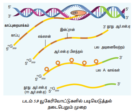 யூகேரியோட்டுகளின் உட்கருவில் குறைந்தது மூன்று வகை ஆர்.என்.ஏ. பாலிமெரேஸ்கள் காணப்படுகின்றன. (செல் உட்பொருட்களில் உள்ள ஆர்.என்.ஏ பாலிமெரேஸ்கள் இல்லாமல்) இம்மூன்று பாலிமெரேஸ்களும் வெவ்வேறு பணிகளைச் செய்கின்றன. ஆர்.என்.ஏ பாலிமெரேஸ்-I, tRNA வை (28S, 18S 58S) படியெடுக்கிறது. ஆர்.என்.ஏ பாலிமெரேஸ்-III, கடத்து ஆர்.என்.ஏ, 5S ரிபோசோம் ஆர்.என்.ஏ மற்றும் SnRNA க்களை படியெடுக்கிறது. ஆர்.என்.ஏ பாலிமெரேஸ்II, தூது ஆர்.என்.ஏவின் முன்னோடியான hnRNA வை (வேறுபட்ட தன்மையுடைய உட்கரு ஆர்.என்.ஏ) (Heterogenous RNA) படியெடுக்கிறது. யூகேரியோட்டுகளில், வெளிப்பாட்டு வரிசையமைப்பின் குறியீடுகளான எக்ஸான் (Exon) மற்றும் வரிசையமைப்பின் குறியீடுகளற்ற இன்ட்ரான் (Intron) ஆகியவற்றிற்கு, மோனோசிஸ்ட்ரானிக் அமைப்பு மரபணுக்கள் இடையூறு செய்கின்றன. பிளத்தல் (Splicing) நிகழ்வால், இன்ட்ரான்கள் நீக்கப்படுகின்றன. hinRNAவில் கூடுதலாக அதன் 5' முனையில், மீதைல் குவானோசைன் ட்ரைபாஸ்பேட் இணைக்கப்படுகிறது. இச்செயல்முறை காப்புறையாக்கம் (capping) எனப்படுகிறது. அதே வேளையில் 3’ முனையில், அடினைலைட் எச்சங்கள் (200-300 Poly A) இணைக்கப்படுகின்றன. இந்நிகழ்வு ‘வாலாக்கம்' (tailing) (படம் 5.9) எனப்படும். இவ்வாறான செயல்முறைகளுக்கு ஆட்பட்ட hnRNA, தற்போது தூது ஆர்.என்.ஏ என அழைக்கப்படுகிறது. இது உட்கருவிலிருந்து மொழியாக்கத்திற்காக, வெளியேற்றப்படுகிறது.