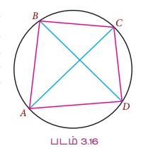 குறிப்பு: (i) தால்மி (CE 100-170) அவர்கள் கோணத்தின் நாணை முக்கோணவியல் சார்பாகக் கொண்டு ஒரு தேற்றத்தை நிரூபித்தார். ஒரு வட்ட நாற்கரத்தில் மூலைவிட்டங்களின் பெருக்கல் அதன் எதிர்ப்பக்கங்களின் பெருக்கலின் கூடுதலுக்குச் சமம். ABCD என்ற வட்ட நாற்கரத்தில்