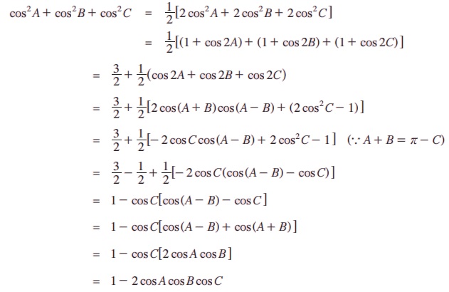 எடுத்துக்காட்டு 3.41 A + B + C = π எனில், cos2 A + cos2B + cos2 C = 1 – 2 cos A cos B cos C என நிறுவுக.