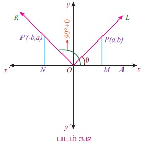 ∠AOL = θ மற்றும் ∠AOR = (90° + θ) என்க. இங்கு P (a, b) என்பது OL மீது இருக்கும் ஒரு புள்ளி மற்றும் P' என்னும் ஒரு புள்ளியானது, OP = OP' ஆக இருக்கும்படி OR - இன் மீது தேர்வு செய்க