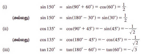 எடுத்துக்காட்டு 3.11 மதிப்புகளைக் காண்க (i) sin 150° (ii) cos 135° (iii) tan 120° .