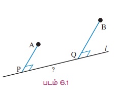 நடைமுறை எடுத்துக்காட்டு 6.2 A மற்றும் B ஆகிய இரு கிராமங்களுக்குச் சிறப்பான மின்சாரம் அளிக்க ஒரு துணை மின் நிலையத்தை l என்ற சாலையில் அமைப்பதற்காக அரசு திட்டமிட்டுள்ளது. A மற்றும் B ஆகிய கிராமங்களுக்கும் l என்ற சாலையிலுள்ள முறையே P மற்றும் Q என்ற செங்குத்து அடி புள்ளிகளுக்கும் இடையே உள்ள தொலைவுகள் முறையே 3 கிமீ மற்றும் 5 கிமீ ஆகும். P மற்றும் Q இவற்றுக்கு இடைப்பட்ட தொலைவு 6 கிமீ எனில், (i) இரு கிராமங்களை துணை மின் நிலையத்துடன் இணைக்கும் கம்பியின் மிகக் குறைந்த நீளம் (கிராமங்களையும் துணை மின்நிலையத்தையும் இணைக்கும் சாலைகள்) மற்றும் (ii) மின் கம்பி செல்லும் பாதையின் சமன்பாடுகள் ஆகியவற்றை எவ்வாறு கணக்கிடலாம்.