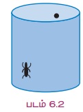 நடைமுறை எடுத்துக்காட்டு 6.3 அடிச்சுற்றளவு 24 செமீ மற்றும் உயரம் 10 செமீ கொண்ட ஒரு உள்ளீடற்ற உருளை வடிவக் கலனின் வெளிப்புறத்தின் அடிப்பகுதியில் இருந்து 4 செமீ உயரத்தில் ஒரு எறும்பு உள்ளது. அதற்கு நேர் எதிரே கலனின் உட்புறத்தில் மேல்பகுதியிலிருந்து 3 செமீ கீழே தேன் துளி ஒன்று உள்ளது. எறும்பு தேன் துளியை அடைய நகர்ந்து செல்லும் மிகக் குறைந்த தூரம் என்னவாக இருக்கும்? எறும்பு நகர்ந்து செல்லும் பாதையின் சமன்பாடு என்னவாக இருக்கும்? (படம் 6.2-ல் எறும்பு மற்றும் தேன் துளி உள்ள இடங்களில் காட்டப்பட்டுள்ளன.)