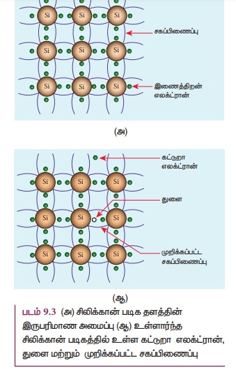 படம் 9.7 (அ) இல் காணலாம். ஜெர்மானிய அணுவில் நான்கு இணைதிறன் எலக்ட்ரான்கள் இருப்பதால்