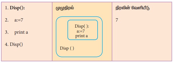 Disp ( ) என்ற செயற்கூறினுள் வரையறுக்கப்பட்டுள்ளது. 'a' என்ற மாறி Disp ( ) என்ற செயற்கூறினுள்