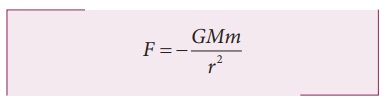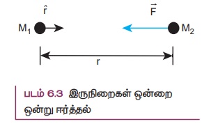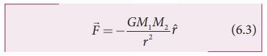 இங்கு M1 லிருந்து M2 நோக்கி செல்லும் அலகு வெக்டர் / ஆகும். (படம் 6.3 பார்க்க) G ஈர்ப்பியல் மாறிலி; G ன் மதிப்பு 6.626 × 10−11 N m2 kg−2 . r-என்பது நிறைகள் M1 மற்றும் M2 இடையே உள்ள தொலைவு. நிறை M1 ஆனது நிறை M2 ஆல் உணரும் ஈர்ப்பியல் விசையை படம் 6.3 ல் வெக்டர் குறிக்கிறது. எதிர்க்குறியானது ஈர்ப்பியல் விசை எப்பொழுதும் ஈர்க்கும் தன்மை உடையது என்பதை குறிக்கிறது. ஈர்ப்பியல் விசையானது எப்போதும் இரு நிறைகளையும் இணைக்கும் நேர்க்கோட்டின் வழியே செயல்படும்.