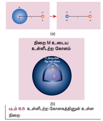 • நம்மை கவரக்கூடிய மற்றொரு முடிவும் உள்ளது. நிறை M உடைய உள்ளீடற்ற கோளம் ஒன்றை கருதுவோம். உள்ளீடற்ற கோளத்தின் உட்புறம் நிறை m ஐ வைப்போம். (படம் 6.5 (5)) நிறை m உணரும் ஈர்ப்பியல் விசை சுழி ஆகும். இதற்கான விளக்கத்தை உயர் வகுப்புகளில் கற்போம்.