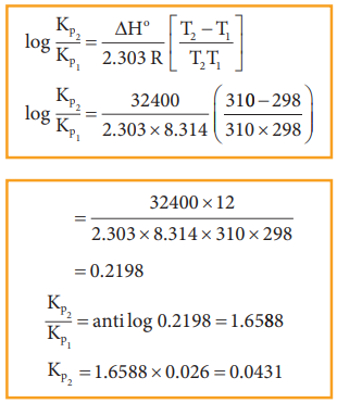 25° C வெப்பநிலையில் ஒரு சமநிலை வினைக்கு Kp = 0.0260 மற்றும் ΔH = 32.4KJmol-1 37o C வெப்பநிலையில் Kpன் மதிப்பினைக் கண்டறிக.
