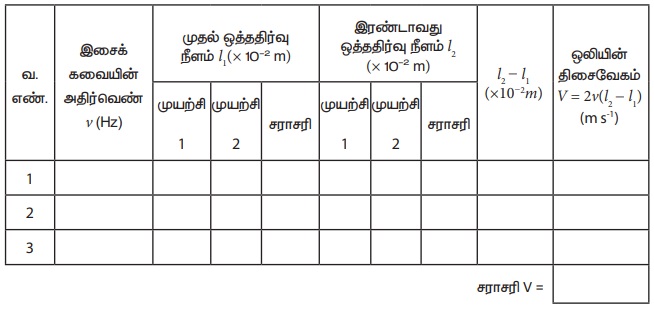 ஒத்ததிர்வு காற்றுத் தம்பத்தை பயன்படுத்தி காற்றில் ஒலியின் திசைவேகம் காணல்.