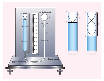• இந்த நிலையில் திரவத்தம்ப உயரம் அளவிடப்படுகிறது. இந்த அளவு முதல் ஒத்ததிர்வு நீளம் l1 ஆக எடுத்துக் கொள்ளப்படுகிறது