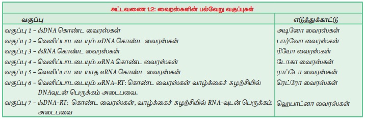 வைரஸ்களுக்கான பல்வேறு வகைப்பாடுகள் வெளிவந்தபோதிலும் 1971 ஆம் ஆண்டில் டேவிட் பால்டிமோர் வெளியிட்ட வகைப்பாடு இங்கே கொடுக்கப்பட்டுள்ளது. இவ்வகைப்பாடு RNA பெருக்கமடையும் தன்மை, மரபணு தொகையத்தின் (Genome) இயற்கைத்தன்மை (ஓரிழை (ss) அல்லது ஈரிழை (ds)), மரபணுக்கள் RNA அல்லது DNA, தலைகீழ் மாற்றத்திற்கான நொதியை (Reverse transcriptase - RT) பயன்படுத்துதல், ஓரிழை RNA வெளிப்பாட்டையும் அல்லது வெளிப்பாடடையாத ஆகிய பண்புகளை அடிப்படையாக வைத்து உருவாக்கப்பட்டது. இந்த வகைப்பாட்டில் வைரஸ்கள் ஏழு வகுப்புகளாக வகைப்படுத்தப்பட்டுள்ளன (அட்டவணை 1.2).