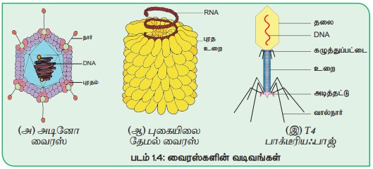 வடிவம், சீரமைவின் அடிப்படையில் வைரஸ்கள் பொதுவாகக் கீழ்க்கண்ட மூன்று முக்கிய வகைகளாகக் காணப்படுகின்றன (படம் 1.4).