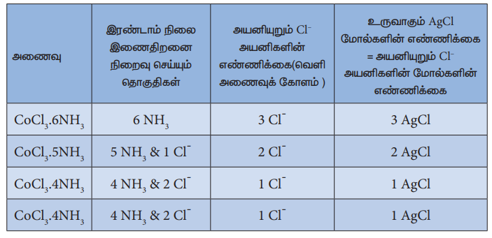 3. இரண்டாம் நிலை இணை திறனானது எதிர் அயனிகள், நடுநிலை மூலக்கூறுகள், நேர் அயனிகள் போன்றனவற்றால் நிறைவு செய்யப்படுகிறது. எடுத்துக்காட்டாக, CoC136NH3ல் கோபால்டின் இரண்டாம் நிலை இணைதிறன் 6 இது ஆறு நடுநிலை அம்மோனியா மூலக்கூறுகளால் நிறைவு செய்யப்படுகிறது. மாறாக, CoC13 5NH3 ல் கோபால்டின் இரண்டாம் நிலை இணை திறனானது ஐந்து நடுநிலை அம்மோனியா மூலக்கூறுகள் மற்றும் ஒரு C1- அயனியால் நிறைவு செய்யப்படுகிறது.