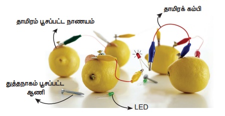 நீங்களாகவே செய்து பார்க்கவும்: படத்தில் காட்டியுள்ளவாறு எலுமிச்சை மின்கலம் அமைக்கவும்.